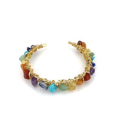 Gold-tone metal base bracelet, hand-wrapped with twisted gold-tone wire and hand-applied chakra-colored stones. Prices: Landed: 30€ Exworks: 22€ Exworks: US$25