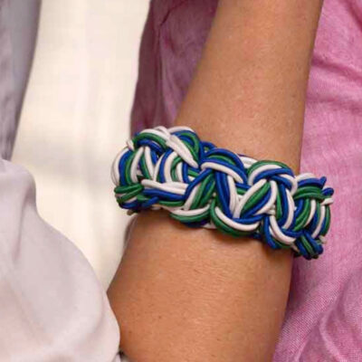 This entire bracelet is handmade with organic-shaped macramé, featuring green, blue, and ivory elastics. The piece is colorful, full of personality, and has a unique design that highlights the beauty of the handcrafted work. Prices: Landed: 28€ Exworks: 20€ Exworks: US$23