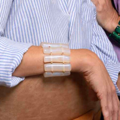 This bracelet is made with opaline resin sticks alternated with small gold metal beads. The iridescent resin brings a delicate and elegant shine to the composition, blending a touch of color with the glow of the metal. The base is a red elastic. Prices: Landed: 28€ Exworks: 20€ Exworks: US$23