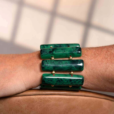 This bracelet is made with malachite-colored resin sticks alternated with small gold metal beads. The vibrant contrast between the resin and the metal's shine makes this piece unique and full of personality. The base is a red elastic. Prices: Landed: 28€ Exworks: 20€ Exworks: US$23