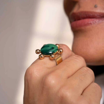 This ring features a gold-plated metal base. The top has a gold metal sun with a malachite half-sphere resin in the center, which adds color and shine to the design. The ring base is adjustable. Prices: Landed: 24€ Exworks: 17€ Exworks: US$20