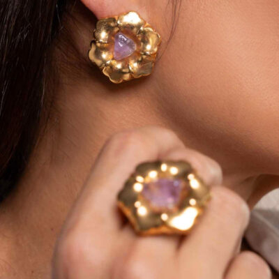 This ring has a gold-plated metal base. The top features a gold metal flower with a natural amethyst stone in its center. The combination of the flower's delicacy and the natural beauty of the stone makes for a unique and charming piece. The ring base is adjustable. Prices: Landed: 24€ Exworks: 17€ Exworks: US$20