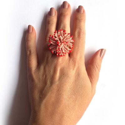 This ring has a gold-plated metal base and a top that resembles a pom-pom. The pom-pom is made entirely with mini beads imported from the Czech Republic in a rosé tone, with coral bead details at the ends. It's a fun piece full of personality. The ring base is adjustable. Prices: Landed: 24€ Exworks: 17€ Exworks: US$20
