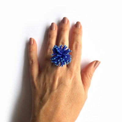 This ring has a gold-plated metal base and a top that resembles a pom-pom. The pom-pom is made entirely with mini beads imported from the Czech Republic in a navy tone, with turquoise bead details at the ends. This piece is colorful and full of personality. The ring base is adjustable. Prices: Landed: 24€ Exworks: 17€ Exworks: US$20