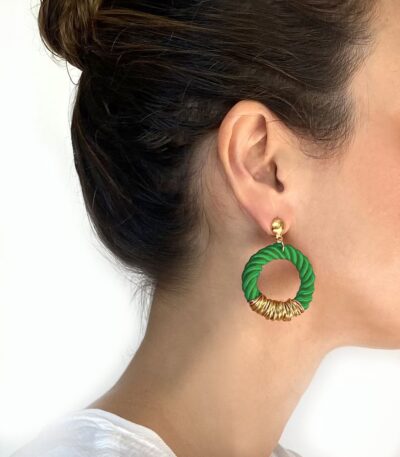 These earrings are artisanally produced using São Francisco cord ( a distinctive material, especially in Brazilian crafts). It features a central detail of hand-wrapped, twisted gold-tone wire. The earring has a gold-tone metal pin and is super lightweight. It's a beautiful blend of cord and metallic wire. Prices: Landed: 24€ Exworks: 17€ Exworks: US$20
