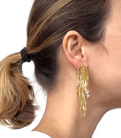 These earrings are hand-crafted by our team of artisans using mini Czech glass beads. It features a mini gold-tone metal pin applied to the back. It's super lightweight. Prices: Landed: 22€ Exworks: 16€ Exworks: US$18