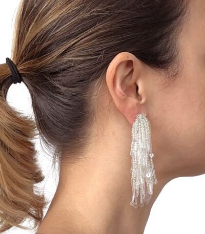 These Brir earrings showcases the unique artistry of our artisans. It's crafted from a tulle-like fabric, entirely hand-embroidered to create a stunning cascading effect with sequins, glass beads, and bugle beads. The result is a piece that is both lightweight and delicate. Prices: Landed: 31€ Exworks: 23€ Exworks: US$26