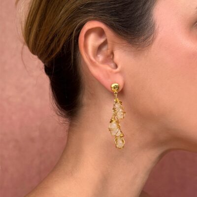 Earrings composed of three natural crystal stones on each side, in a clear tone and organic cut that softly reflects light. The stones are hand-wrapped with golden metal wire, forming a lightweight wiring that enhances their natural sparkle and brings sophistication to your look. A versatile accessory with handcrafted elegance. Golden metal post. Prices: Landed: 28€ Exworks: 20€ Exworks: US$23