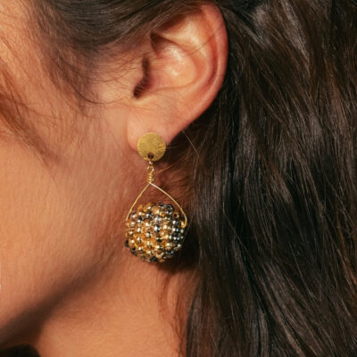 Earrings featuring a voluminous sphere made of mixed silver and gold metallic beads, meticulously attached by hand to create a bicolor effect. The sphere hangs from a golden metal wire, which is finished with a delicate hand-twisted detail just below the golden stud. Prices: Landed: 36€ Exworks: 26€ Exworks: US$30