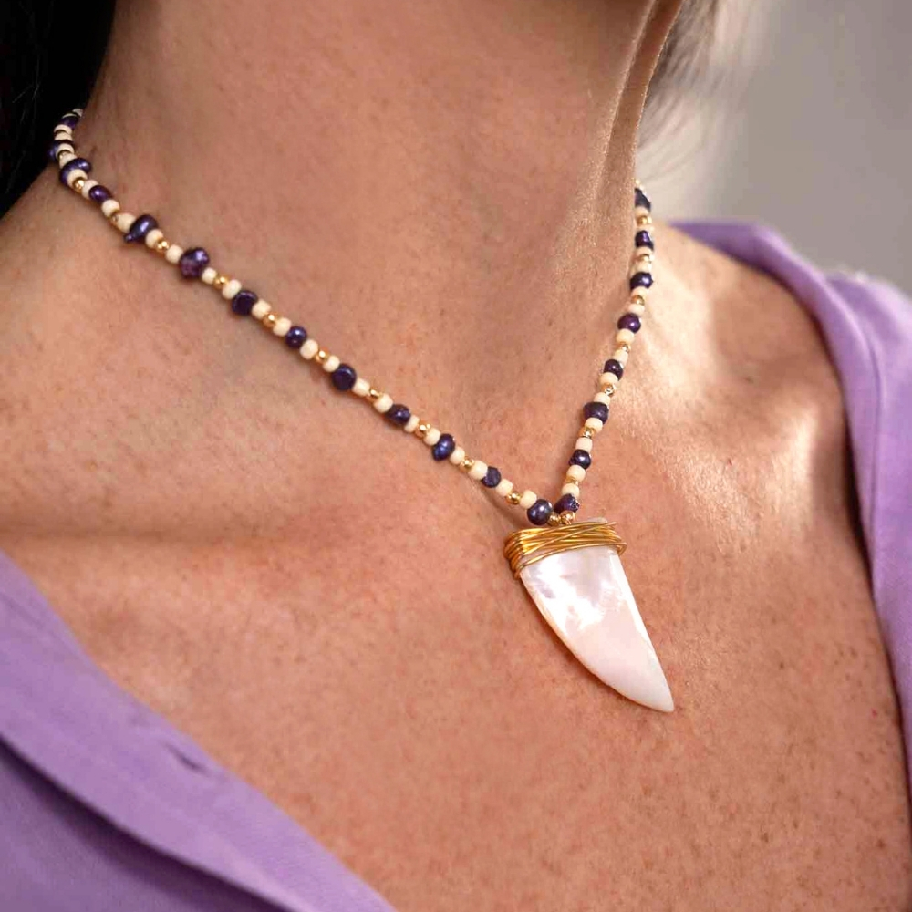 This necklace features a sequence of small gold metal beads, purple pearls, and sand-colored beads. The pendant is a Mother-of-pearl tooth, wired at the top. The piece combines natural and metallic elements in a delicate and modern way. It has an adjustable gold-plated metal clasp.