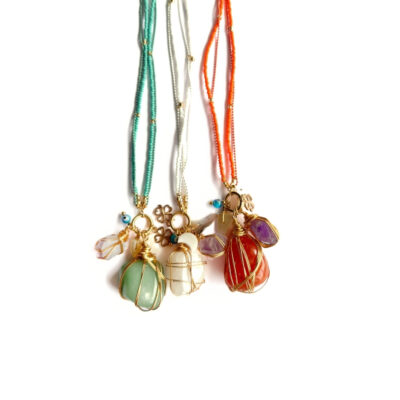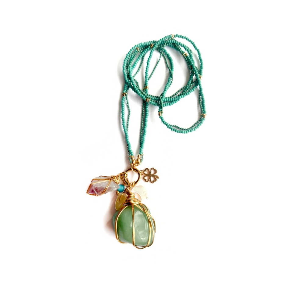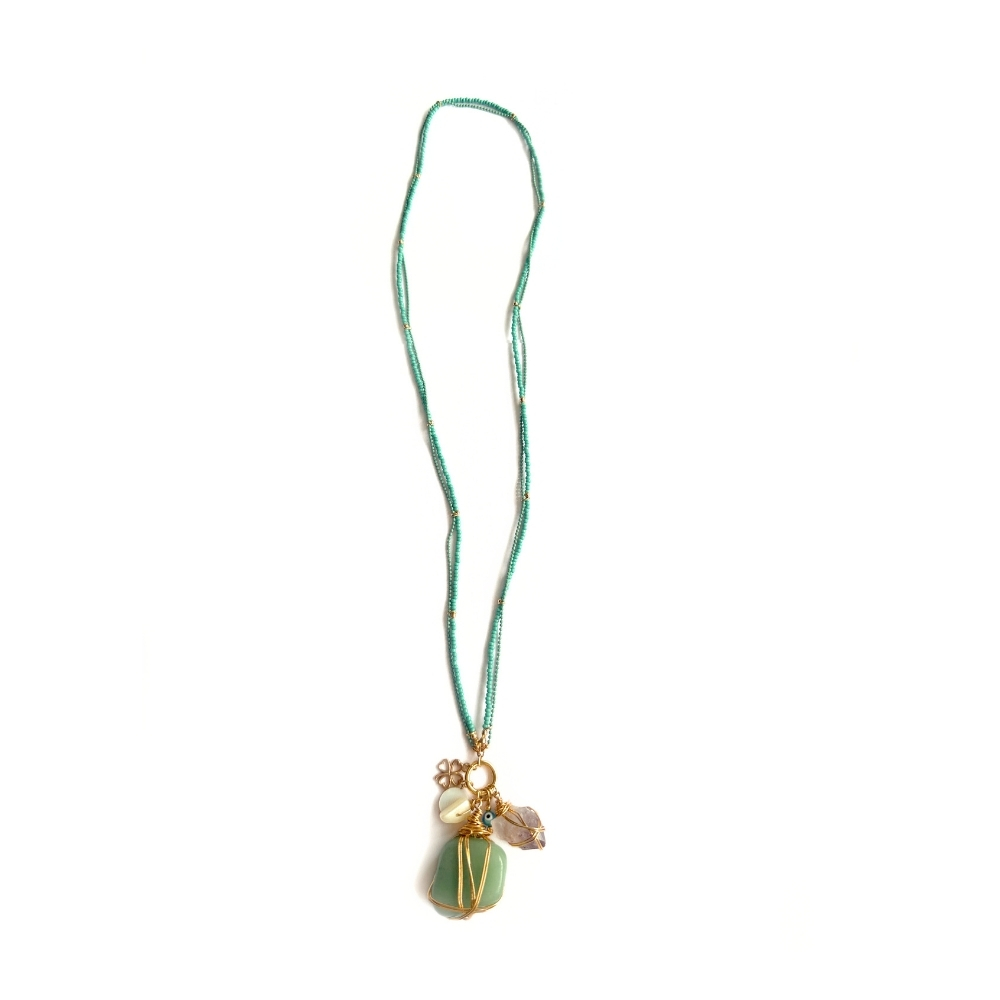 This is a handmade necklace, crafted with acqua beads and a acqua ball chain. Throughout the piece, golden metal beads add a touch of light and elegance. The cluster of pendants includes a white milky quartz stone wrapped in golden metal wire, an amethyst stone also manually intertwined with golden metal wire, a hollowed-out golden metal clover, a mother-of-pearl half-moon, a mini glass evil eye and a resin pearl. This is a timeless piece rich in symbolism.