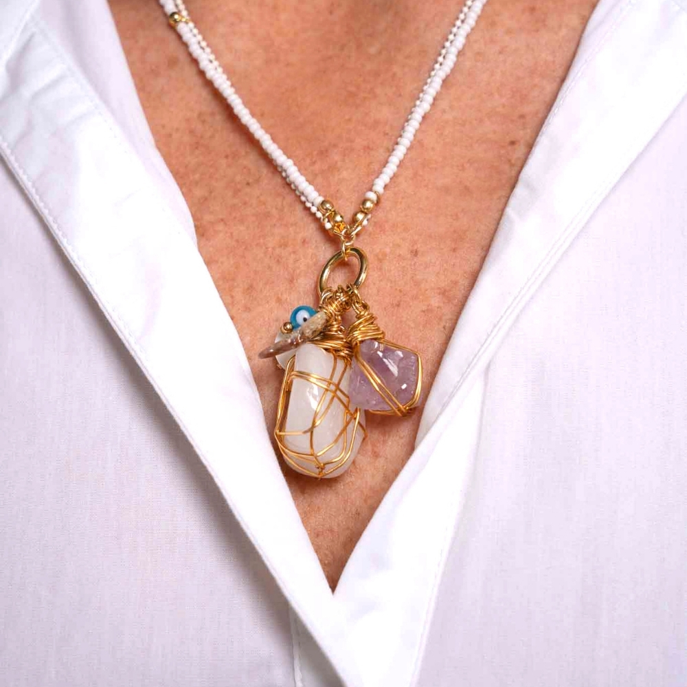 This is a handmade necklace, crafted with white beads and a white ball chain. Throughout the piece, golden metal beads add a touch of light and elegance. The cluster of pendants includes a white milky quartz stone wrapped in golden metal wire, an amethyst stone also manually intertwined with golden metal wire, a hollowed-out golden metal clover, a mother-of-pearl half-moon, a mini glass evil eye and a resin pearl. This is a timeless piece rich in symbolism.