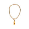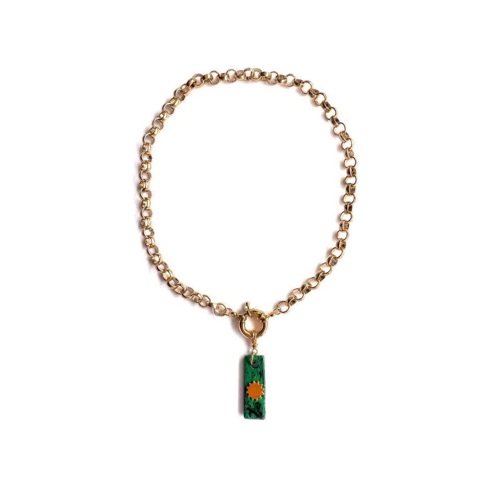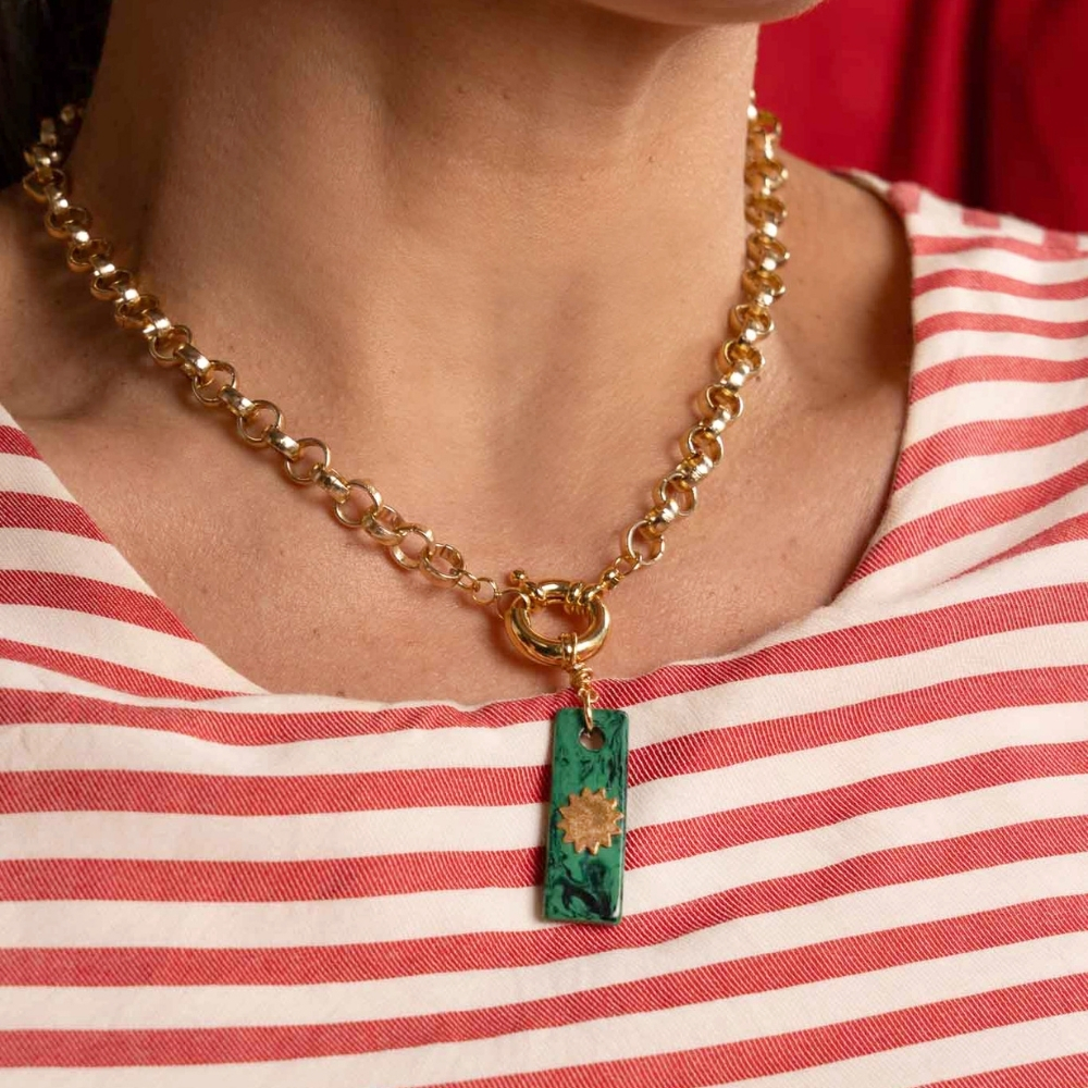This necklace features a full gold-plated Portuguese link chain. The main highlight is the gold-plated buoy clasp, worn in the front, which serves as an elegant holder for the pendant. The malachite resin plate, with an organically shaped semi-precious piece in the center, connects directly to the clasp. The composition gains shine and sophistication, uniting the beauty of the resin with the modernity of the piece.