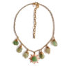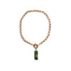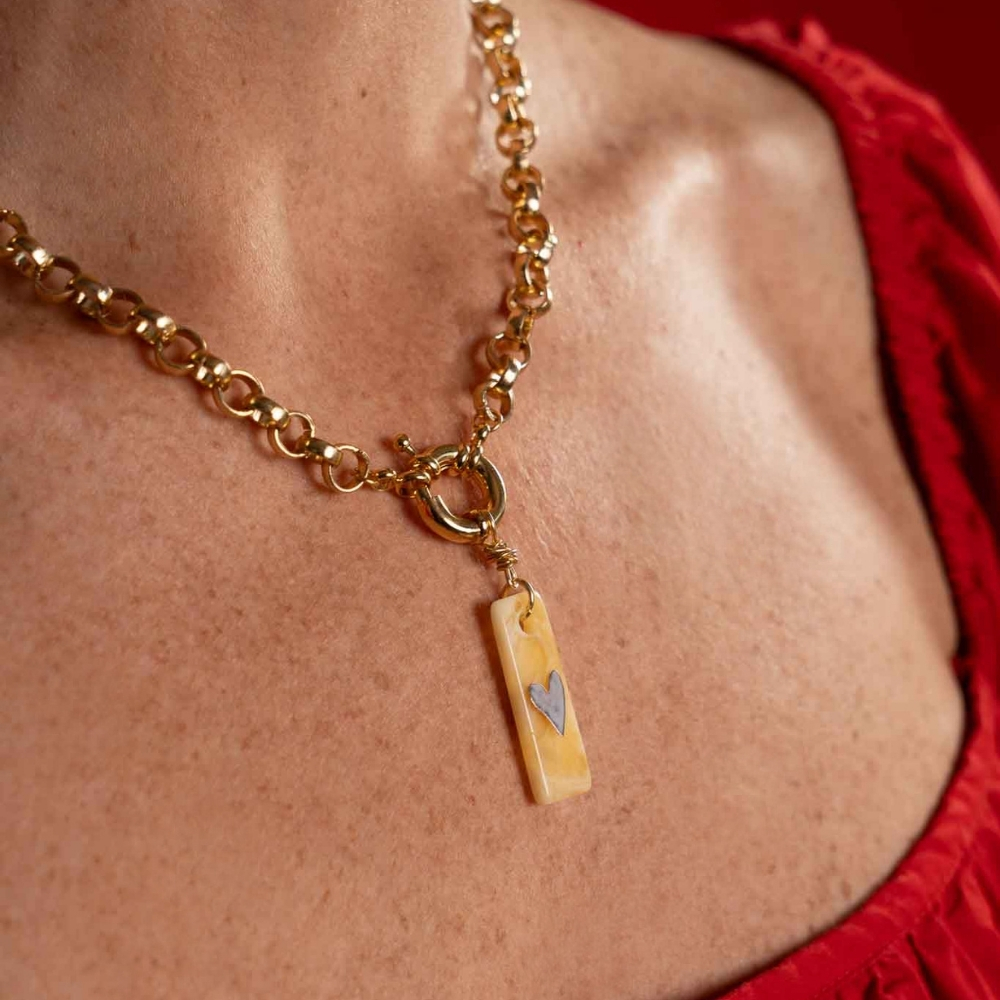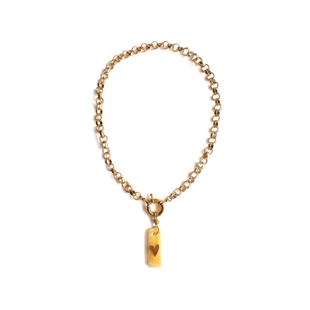 This necklace features a full gold-plated Portuguese link chain. The main highlight is the gold-plated buoy clasp, worn in the front, which serves as an elegant holder for the pendant. The raw resin plate, with a heart-shaped semi-precious piece in the center, connects directly to the clasp, creating a modern and unique look. The delicate contrast between the resin’s texture and the metal’s shine makes the piece versatile for any occasion.