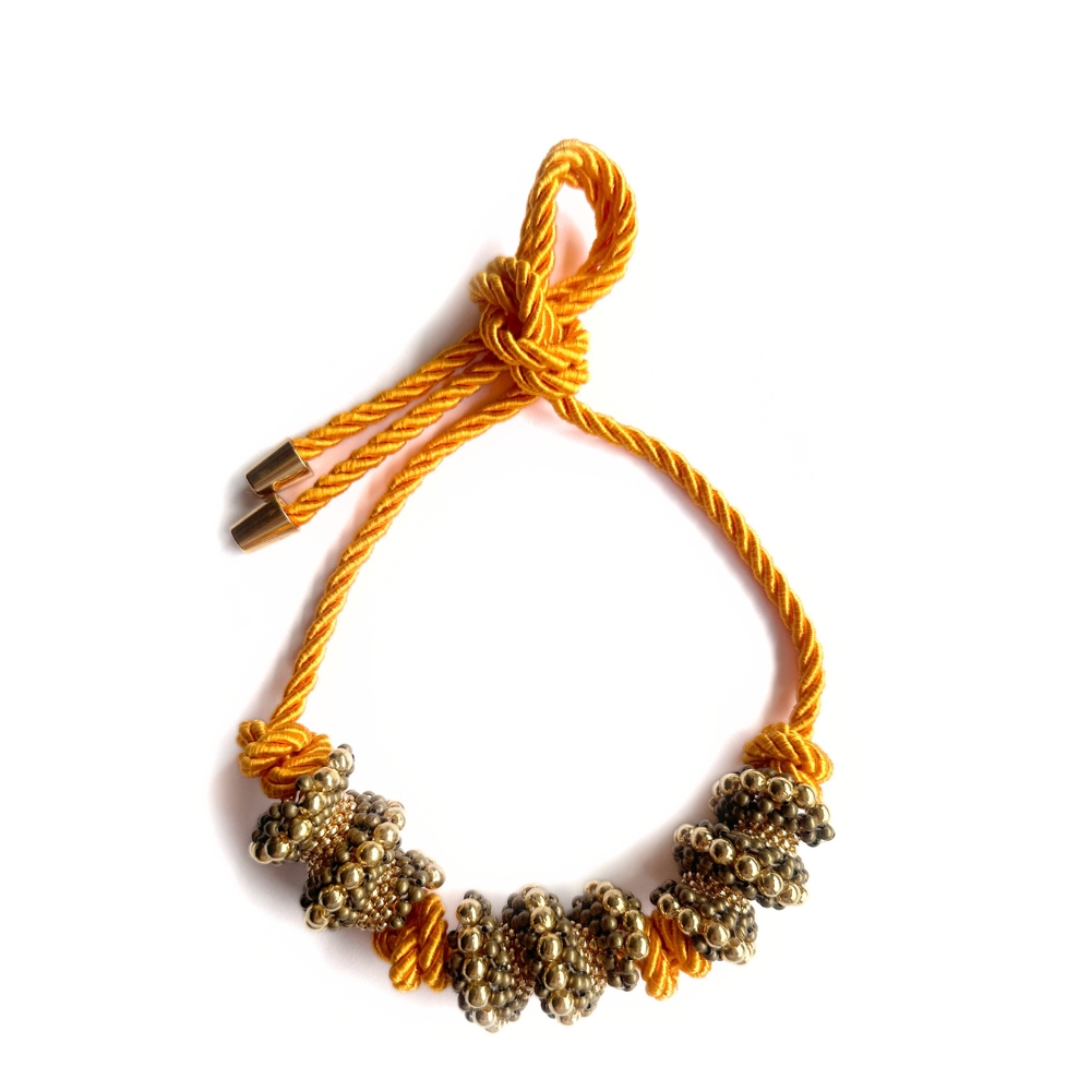 This is a handmade necklace with a base of yellow Saint Francis cord. It features three handmade embroideries in a wave-like shape, alternating with knots made from the cord itself. Each embroidery is composed of a mix of medium and small metallic beads and antique gold-toned beads, adding sparkle and sophistication. Adjustable length.