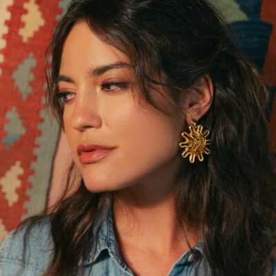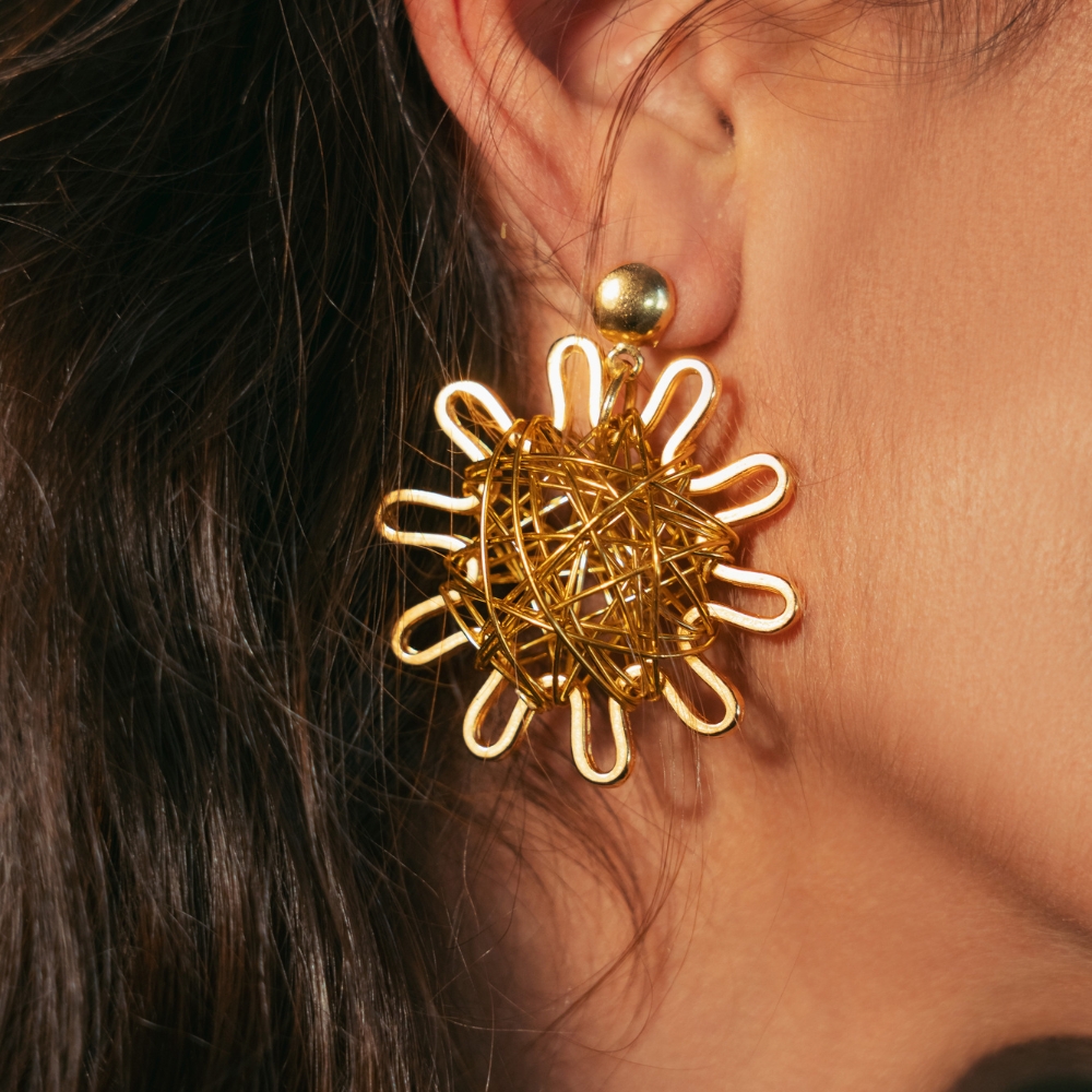 These earrings are crafted from gold-toned metal, featuring a circular structure of curved loops that spread out like rays. Hand-woven gold metallic threads are interlaced over this base, creating a central weave that enhances the idea of shine and energy. The shape of the piece directly references the sun, the inspiration behind its name. Lightweight yet striking, it’s an accessory that brightens any outfit. It has a gold-toned metal pin.