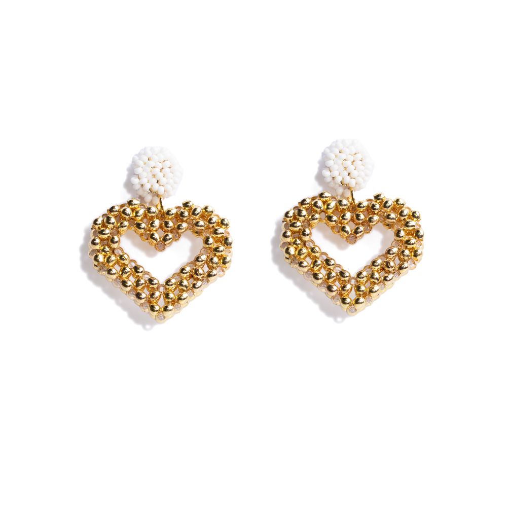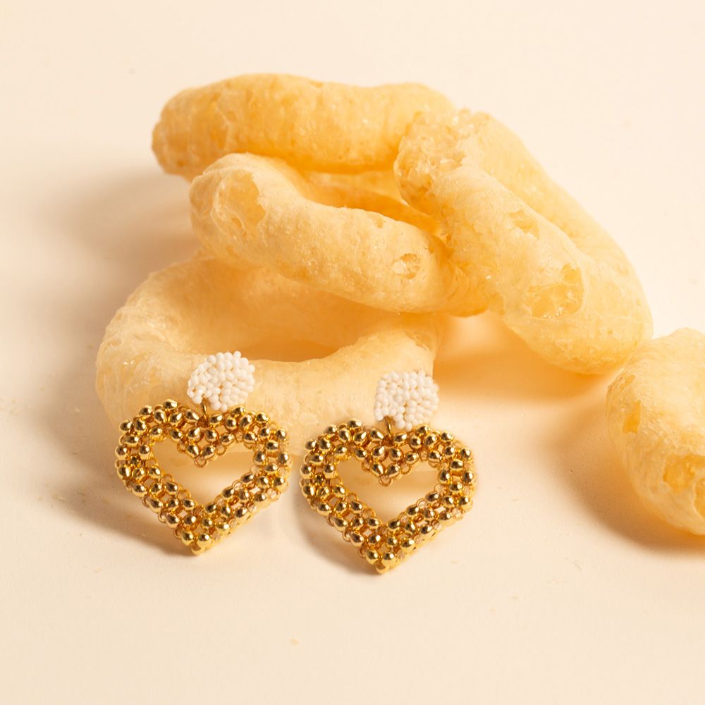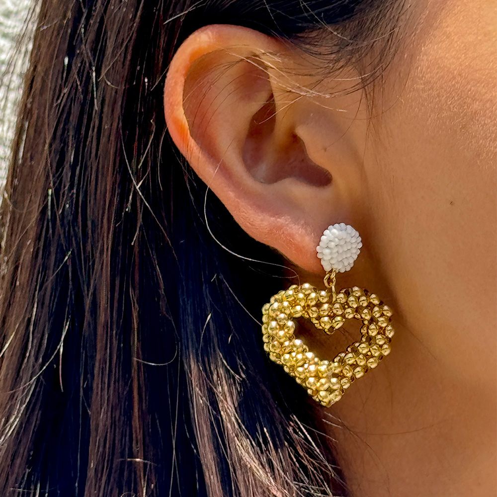 These Brir earrings are crafted around a beautiful golden heart, a truly special piece entirely handmade, bead by bead, by our top artisan. The metal pin is also manually “wrapped” by our team of artisans with our mini white Czech glass beads.