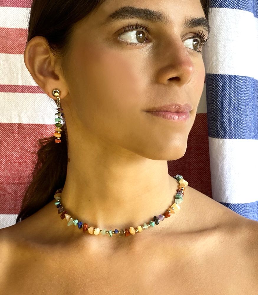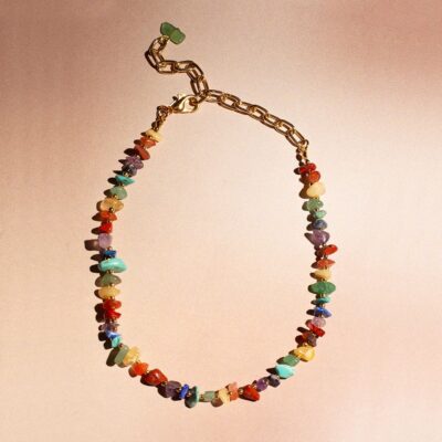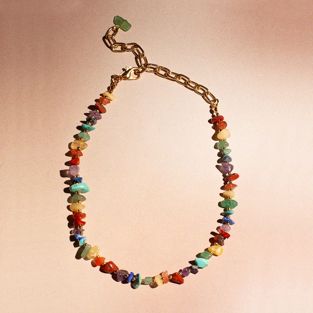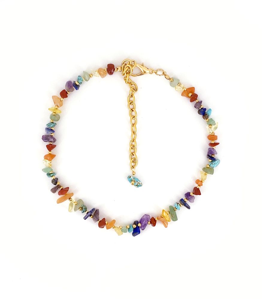 This piece of jewelry likely combines the aesthetic appeal of a choker with the symbolic meaning of chakras and the natural beauty of various gemstones. The “Gold” refers to gold-colored metal components, with an adjustable extender chain.