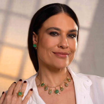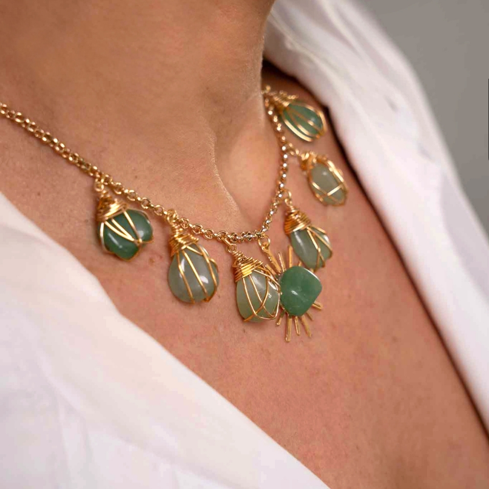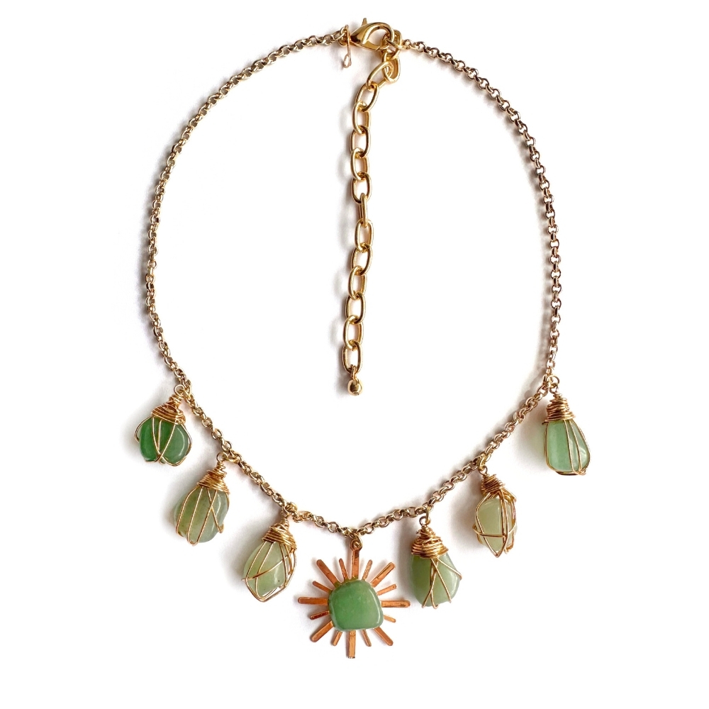 This necklace features six green quartz stones hand-wrapped with gold metal wire, and a gold metal sun. The sun, which is placed between two sequences of stones, has a green quartz stone in the center. The piece harmoniously and elegantly combines the energy of the stone with the radiance of the sun. It has an adjustable gold-plated metal clasp.