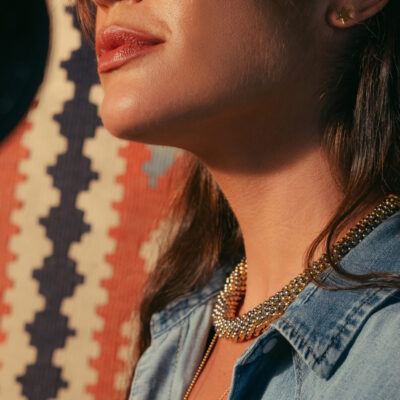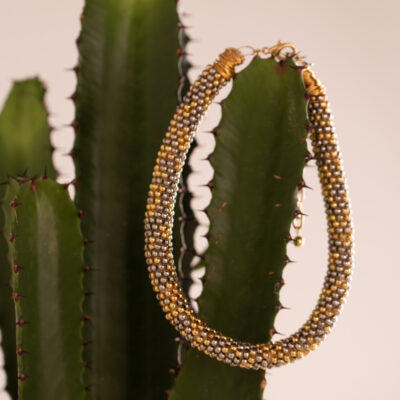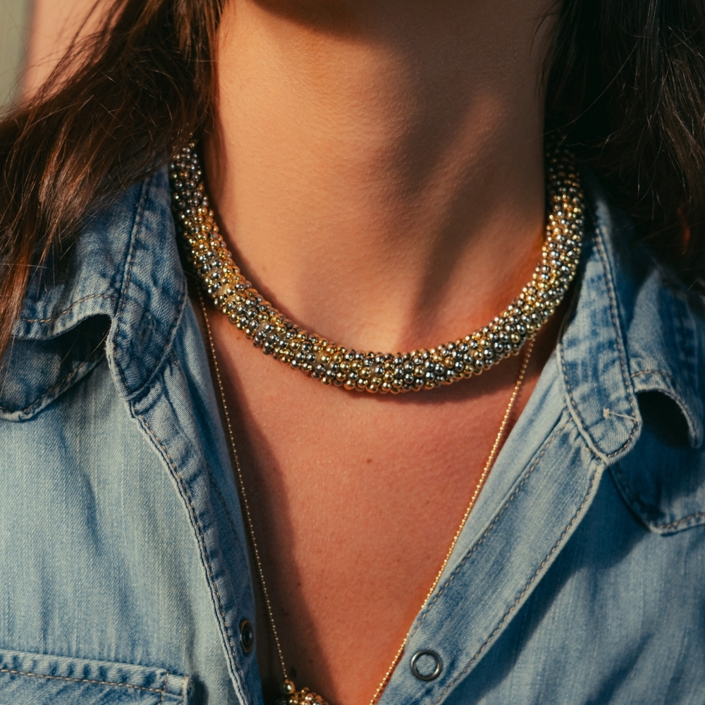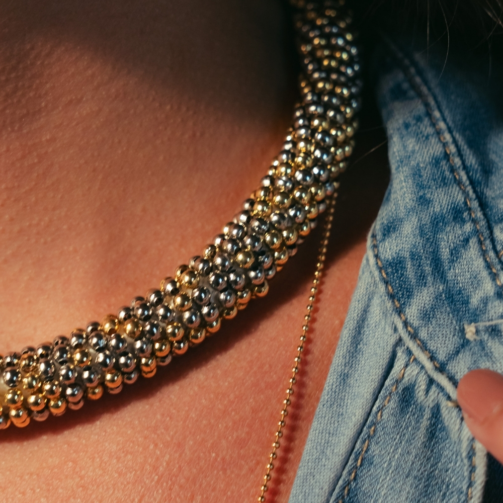 A necklace with a structure entirely hand-covered in a mix of metallic silver and gold beads, creating a beautiful, luminous, and sophisticated texture. The ends are finished with handcrafted gold-toned wire. It’s a lightweight and versatile model with an adjustable clasp.
