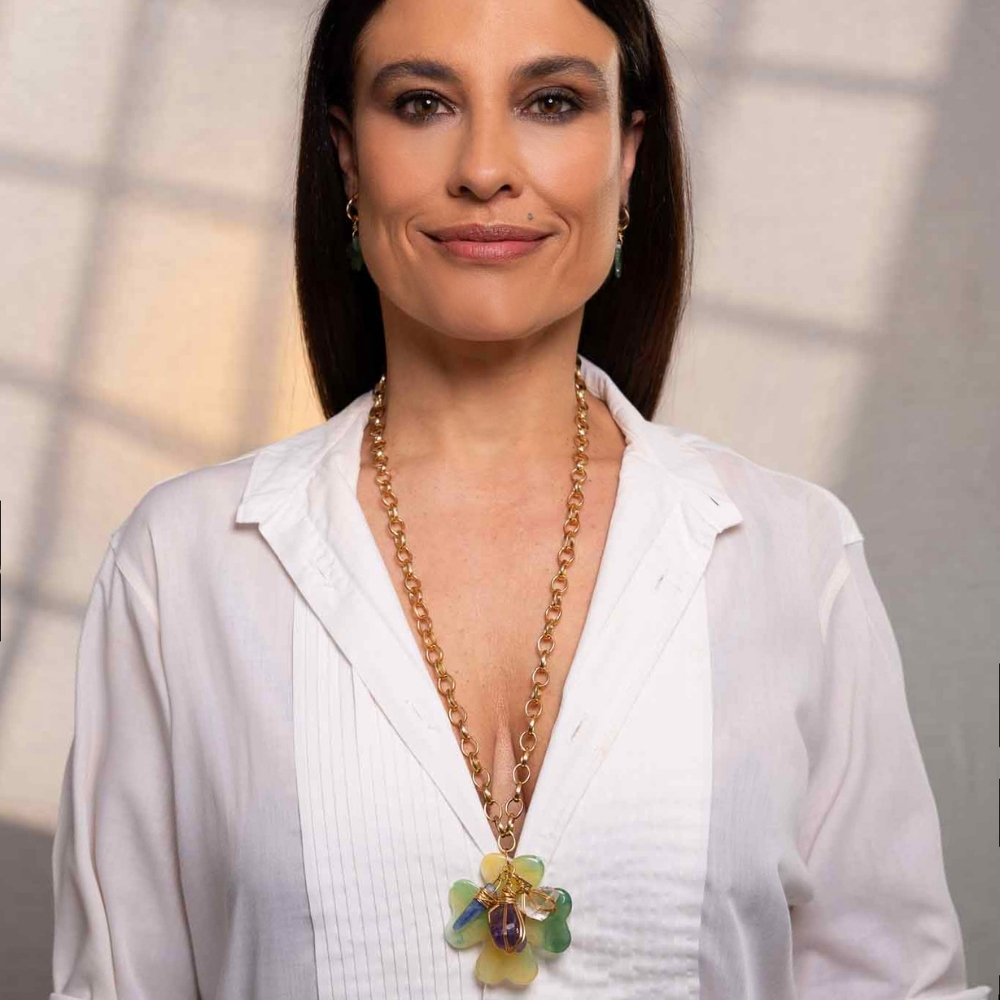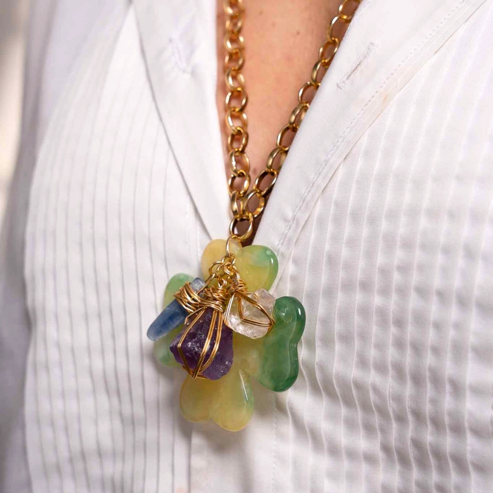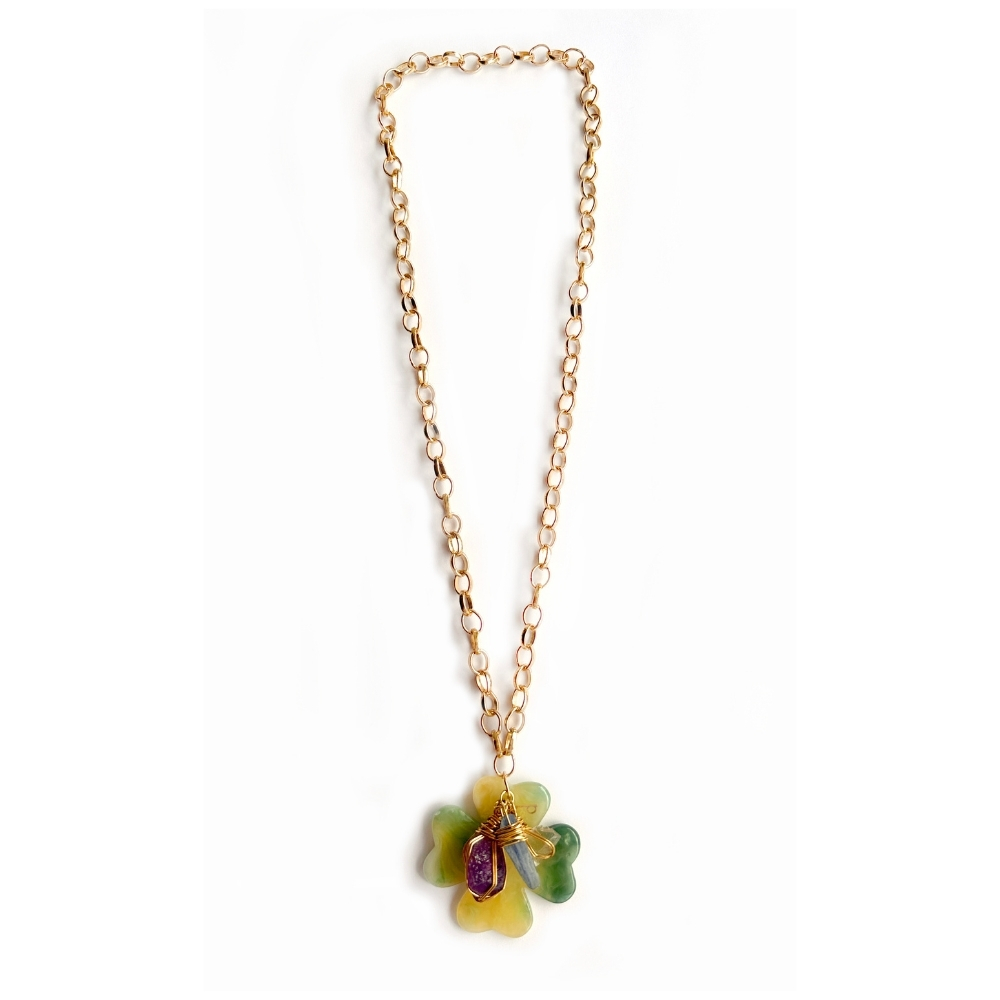 This necklace features a full gold-plated metal chain. The pendants include a large green resin clover and natural amethyst, crystal quartz, and kyanite stones, all hand-wired with gold metal wire. It’s a modern and sophisticated amulet, perfect for bringing luck and style. It does not have a clasp.