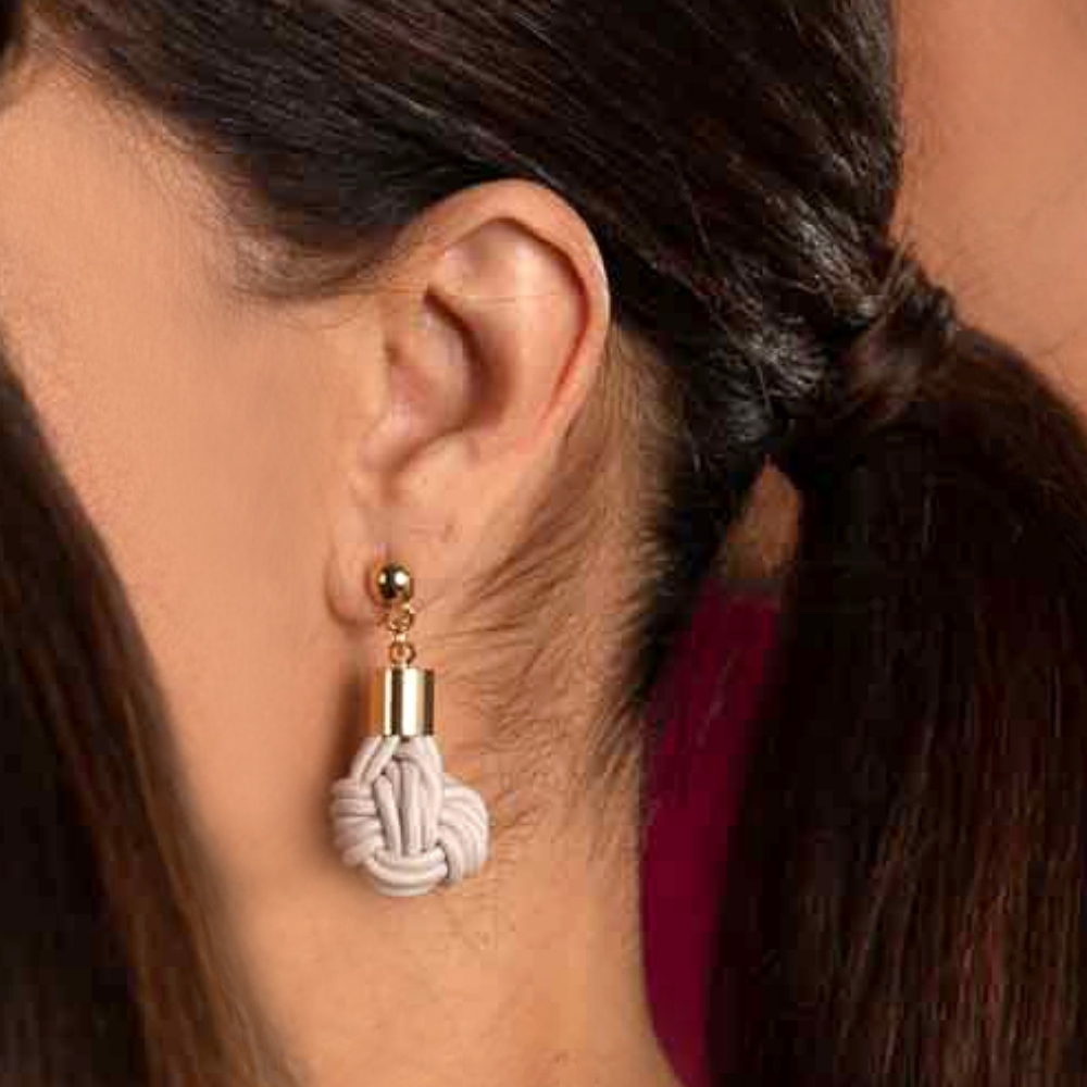 This macramé earring features an organic, knot-like shape made with raw elastic. The piece is finished with a golden metal cylinder, adding a sophisticated touch to its handmade style. It comes with a golden metal post.