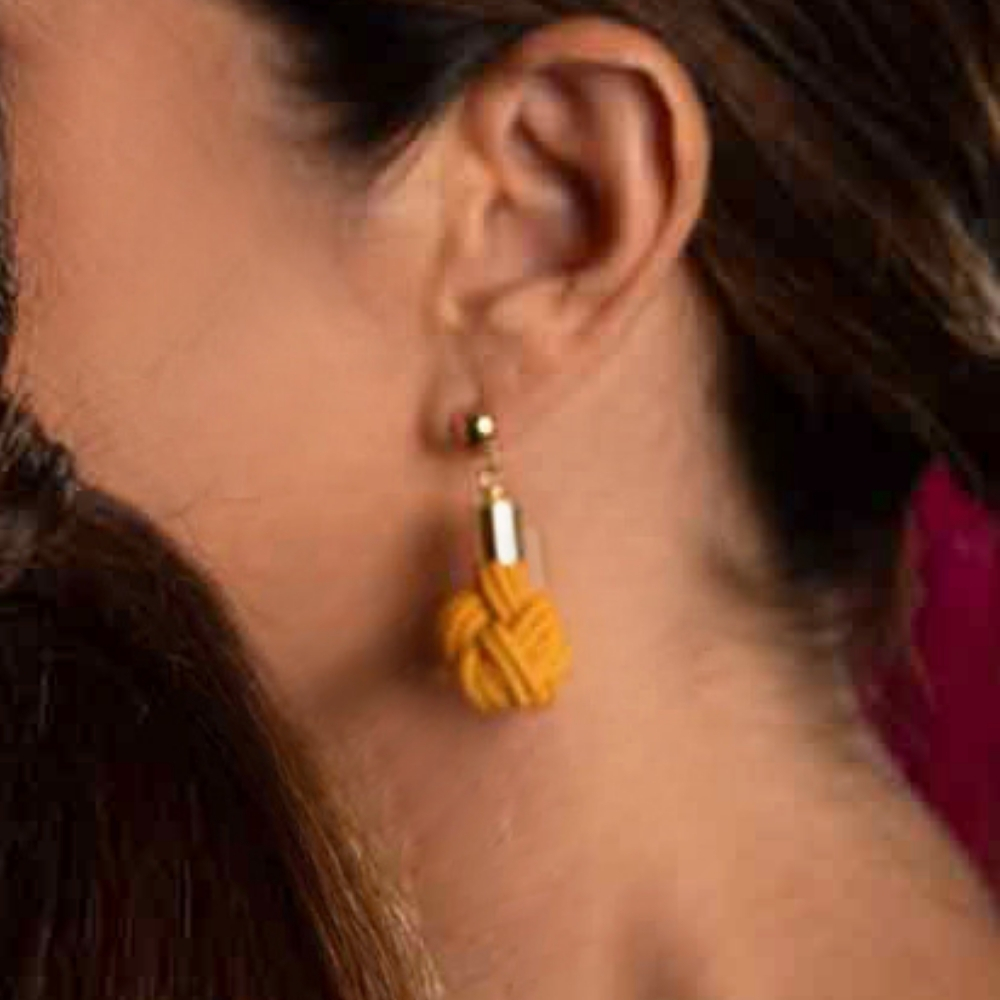 This macramé earring features an organic, knot-like shape made with yellow elastic. The piece is finished with a golden metal cylinder, adding a sophisticated touch to its handmade style. It comes with a golden metal post.