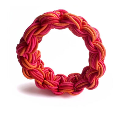 This entire bracelet is handmade with organic-shaped macramé, featuring pink, red and orange elastics. The piece is colorful, full of personality, and has a unique design that highlights the beauty of the handcrafted work.