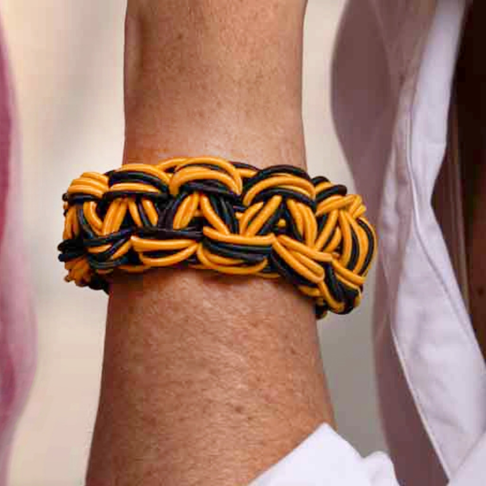 This entire bracelet is handmade with organic-shaped macramé, featuring yellow and black elastics. The piece is colorful, full of personality, and has a unique design that highlights the beauty of the handcrafted work.