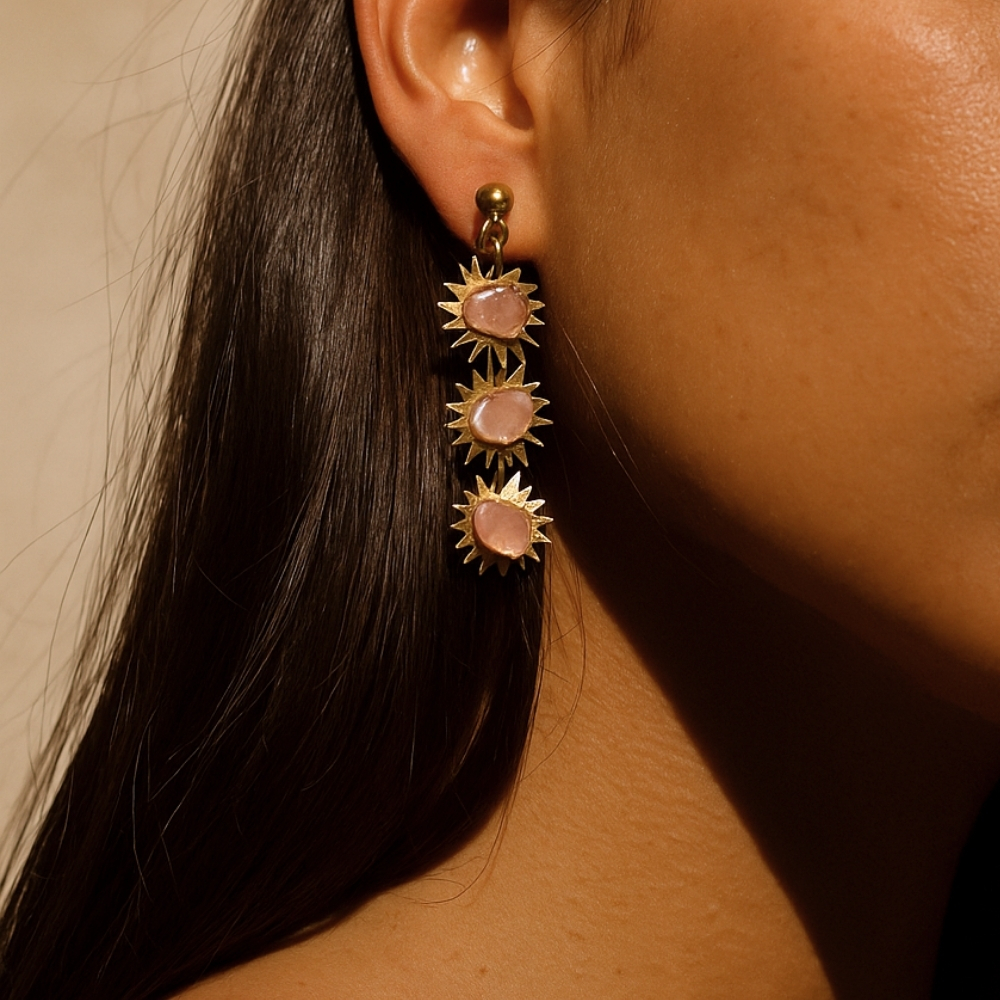 Earrings composed of three gold metal sun-shaped pieces. In the center of each sun, a pink glass gravel is added, creating a light and colorful look. A delicate and vibrant accessory. With a gold-plated pin.