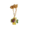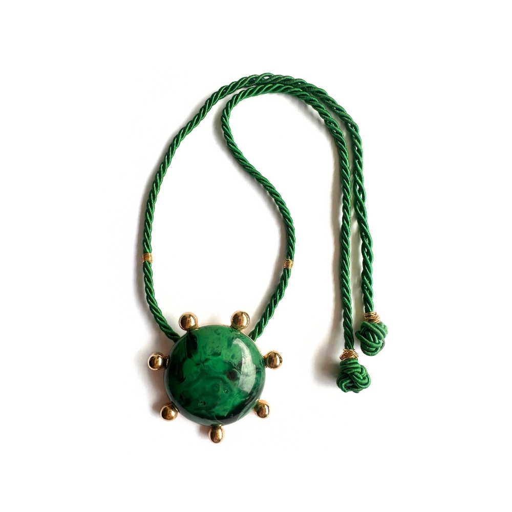 This necklace features a large golden metal sun pendant on an green Saint Francis cord. The center of the sun has a half-sphere opaline resin that brings a subtle sparkle and an iridescent effect, uniting the sun’s radiance with the stone’s delicacy. It includes golden metal wire details and has an adjustable length.