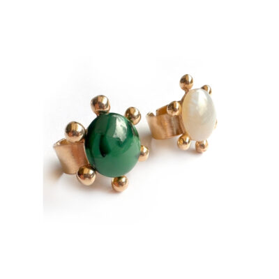 This ring features a gold-plated metal base. The top has a gold metal sun with a malachite half-sphere resin in the center, which adds color and shine to the design. The ring base is adjustable.